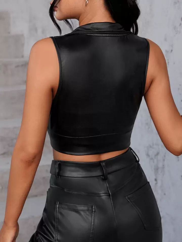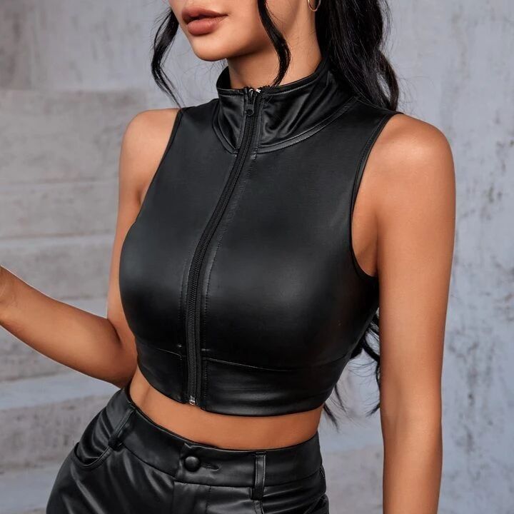 Descubre el equilibrio perfecto entre estilo y versatilidad con esta blusa corta en cuerina sin mangas con cuello alto y cierre delantero, diseñada para resaltar la figura con un toque moderno y elegante. Su diseño ajustado y minimalista la convierte en una prenda ideal para combinar en diferentes outfits, desde looks casuales hasta estilos más sofisticados. Perfecta para quienes buscan blusa en cuerina para mujer, crop top elegante, blusa sin mangas con cierre frontal, blusa cuello alto, outfit moderno y versátil, moda femenina en tendencia y look chic, esta pieza se convierte en un básico imprescindible para lucir segura, elegante y a la moda en cualquier ocasión.