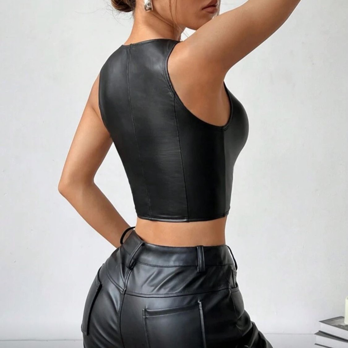 Esta blusa corta de dama en cuerina ajustada al cuerpo es ideal para mujeres que buscan un look moderno, elegante y en tendencia. Su diseño con tiras anchas sobre los hombros aporta estructura y comodidad, mientras que los bolsillos falsos delanteros y los botones frontales añaden un toque sofisticado y estilizado. Confeccionada en cuerina de alta calidad, esta blusa en cuerina para mujer ofrece un ajuste favorecedor que realza la silueta femenina. Es perfecta para combinar con pantalones, faldas o shorts de tiro alto, convirtiéndose en una prenda versátil para outfits urbanos, casuales elegantes o nocturnos.