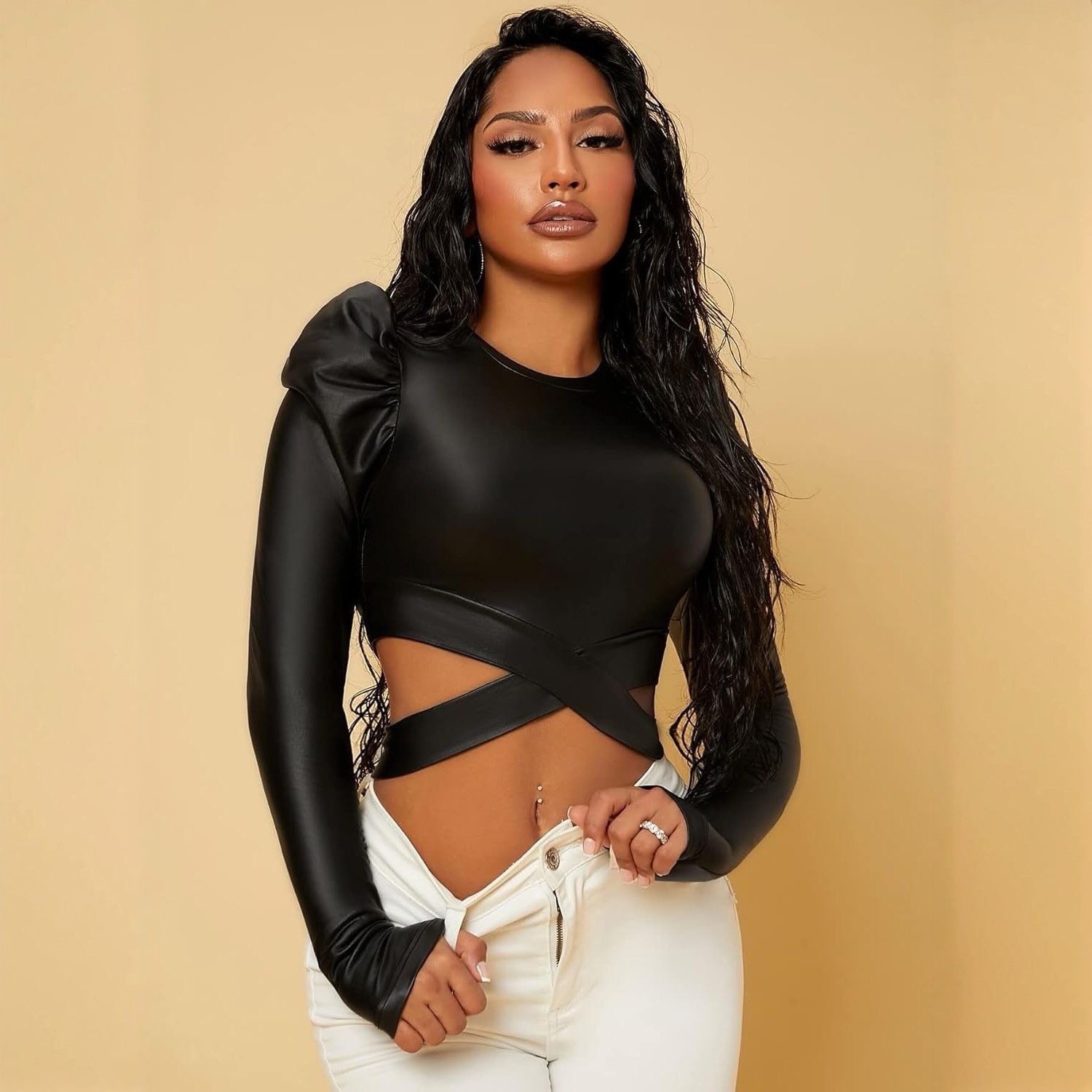 Luce un estilo sofisticado y moderno con esta blusa elegante en cuerina de manga larga con mangas bombachas y diseño cruzado en el abdomen, creada para resaltar la figura y aportar un toque coqueto. Las mangas bombachas brindan volumen y estilo único, mientras que el detalle cruzado en el abdomen estiliza la silueta y añade un efecto visual impactante. Perfecta para salidas nocturnas, eventos especiales y looks de oficina con estilo, esta blusa combina blusa en cuerina para mujer, blusa elegante manga larga, blusa con mangas bombachas, blusa cruzada en abdomen, outfit moderno y coqueto, moda femenina en tendencia y look sofisticado, convirtiéndose en una pieza imprescindible para lucir segura, elegante y con personalidad.