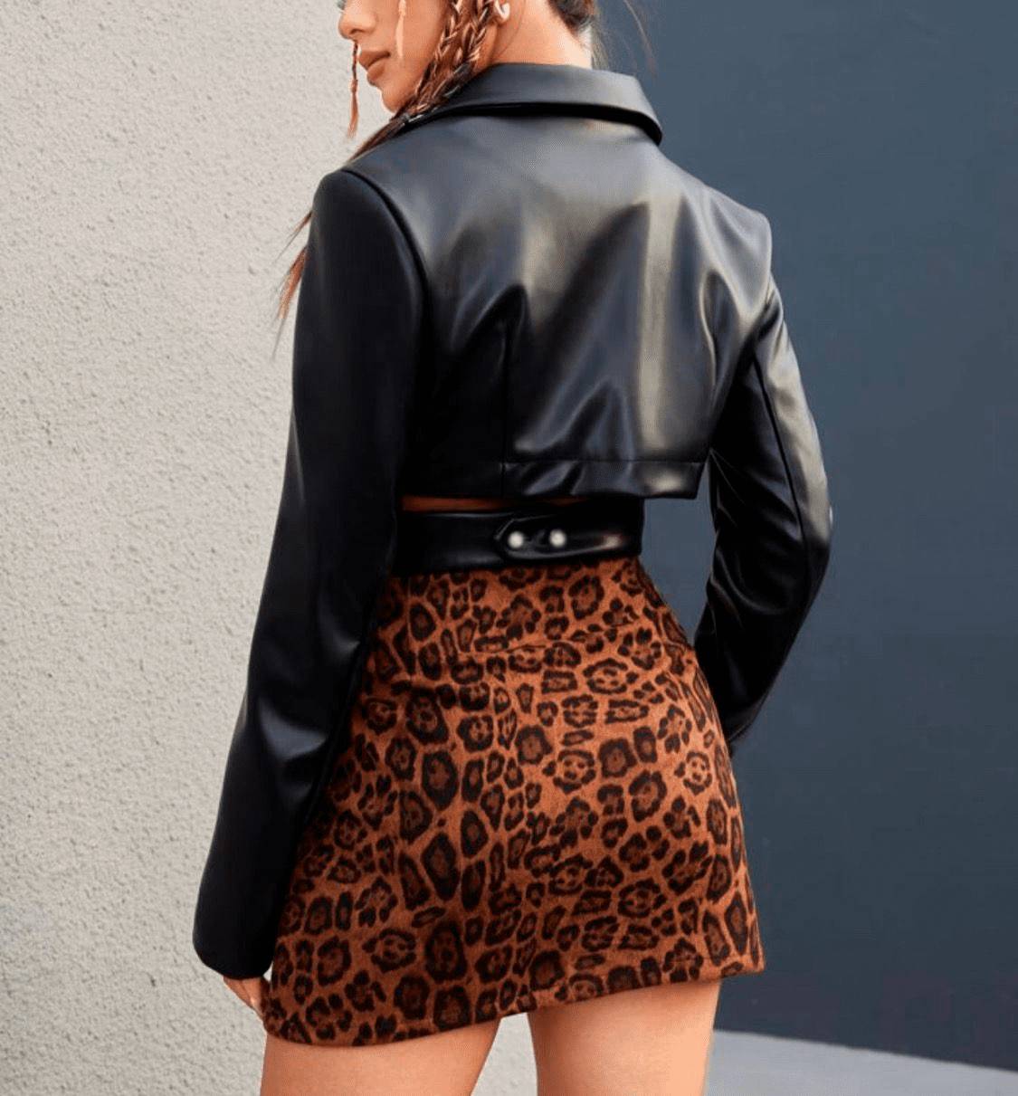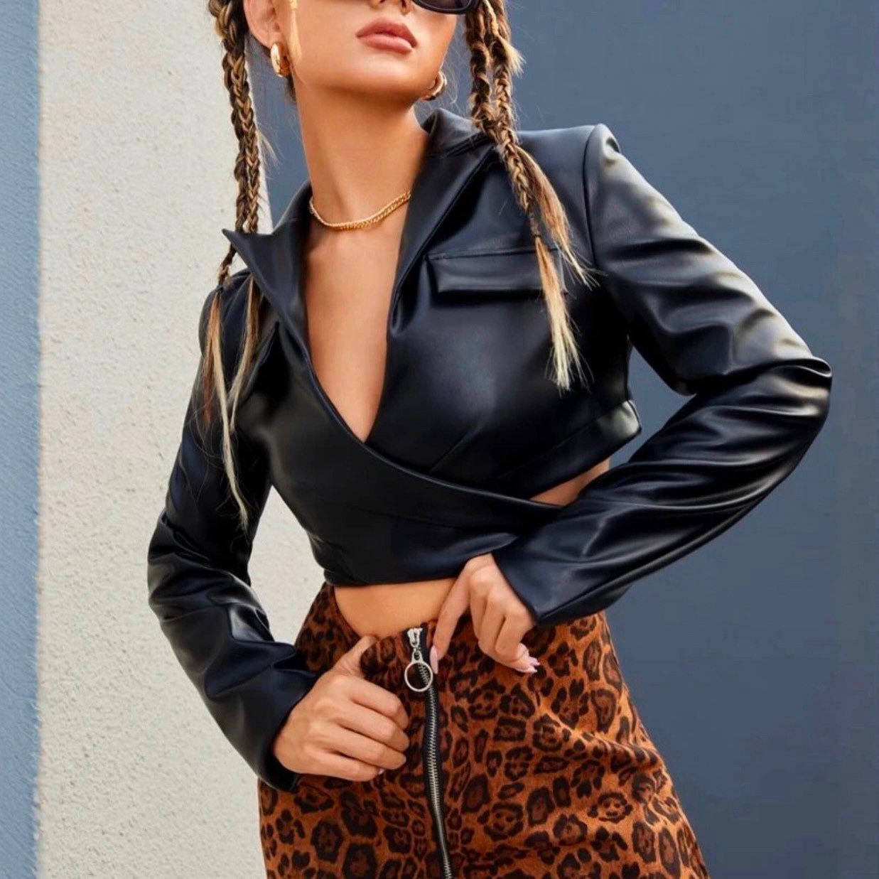 Chaqueta en cuerina para mujer corta con mangas largas falsos bolsillos y tiras envolventes en la cintura con ajuste en la espalda mediante botones plateados diseño elegante moderno y sofisticado ideal para outfits casual chic looks de noche y estilos en tendencia