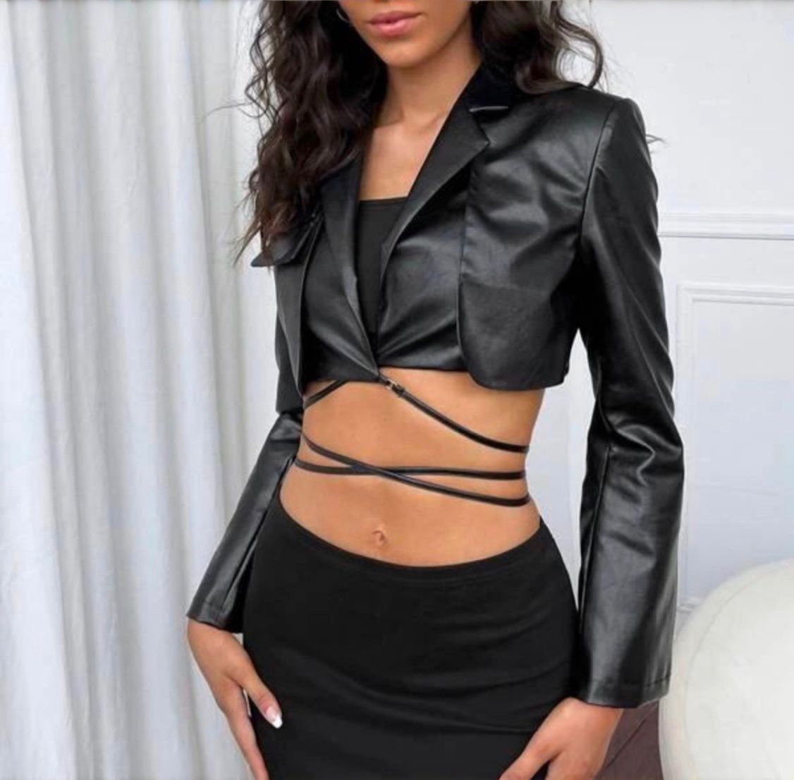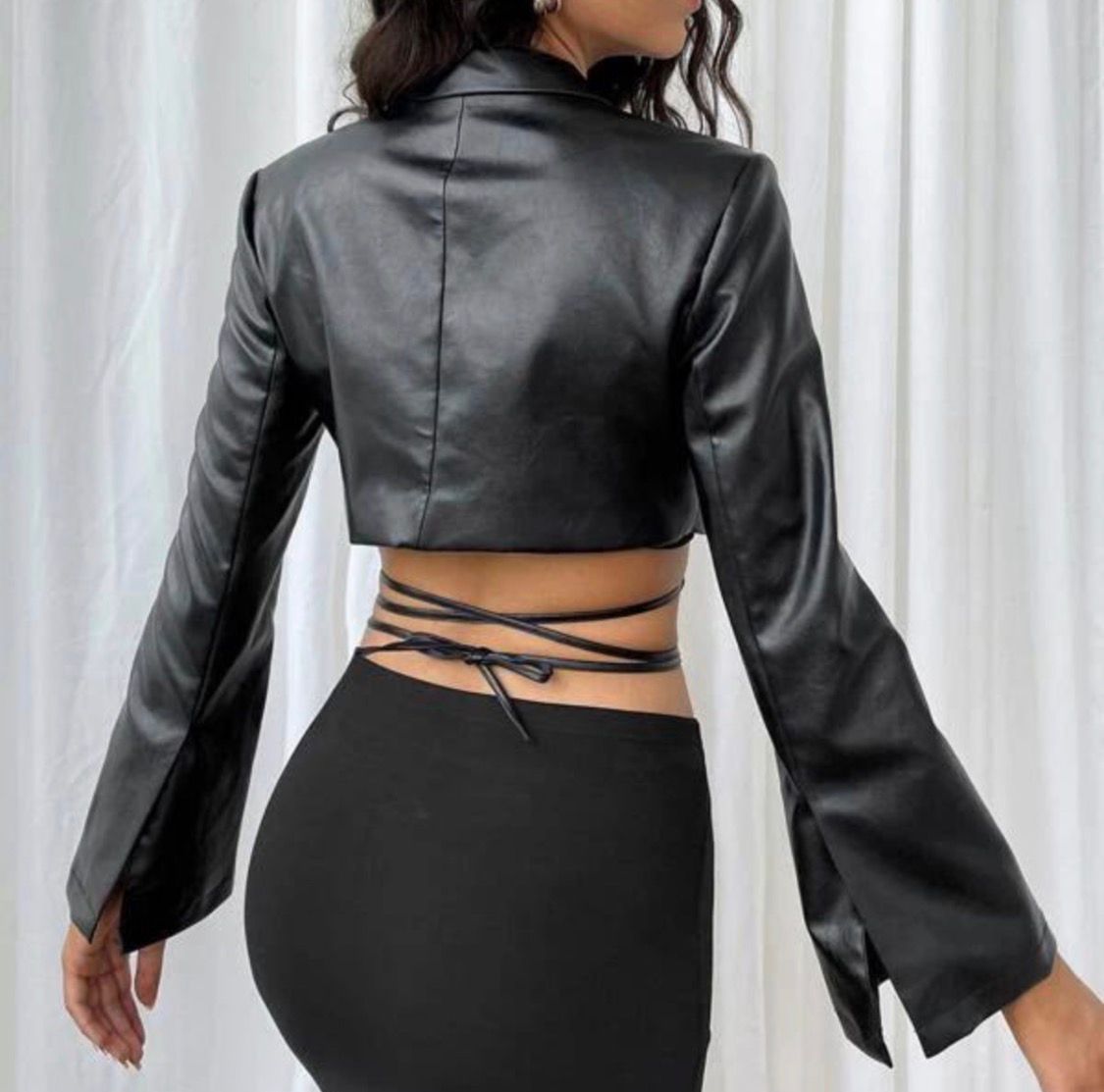 Chaqueta corta en cuerina para mujer con mangas largas falsos bolsillos y tiras envolventes en la cinttil ideal para outfits casual chic looks de noche y estilos en tendencia