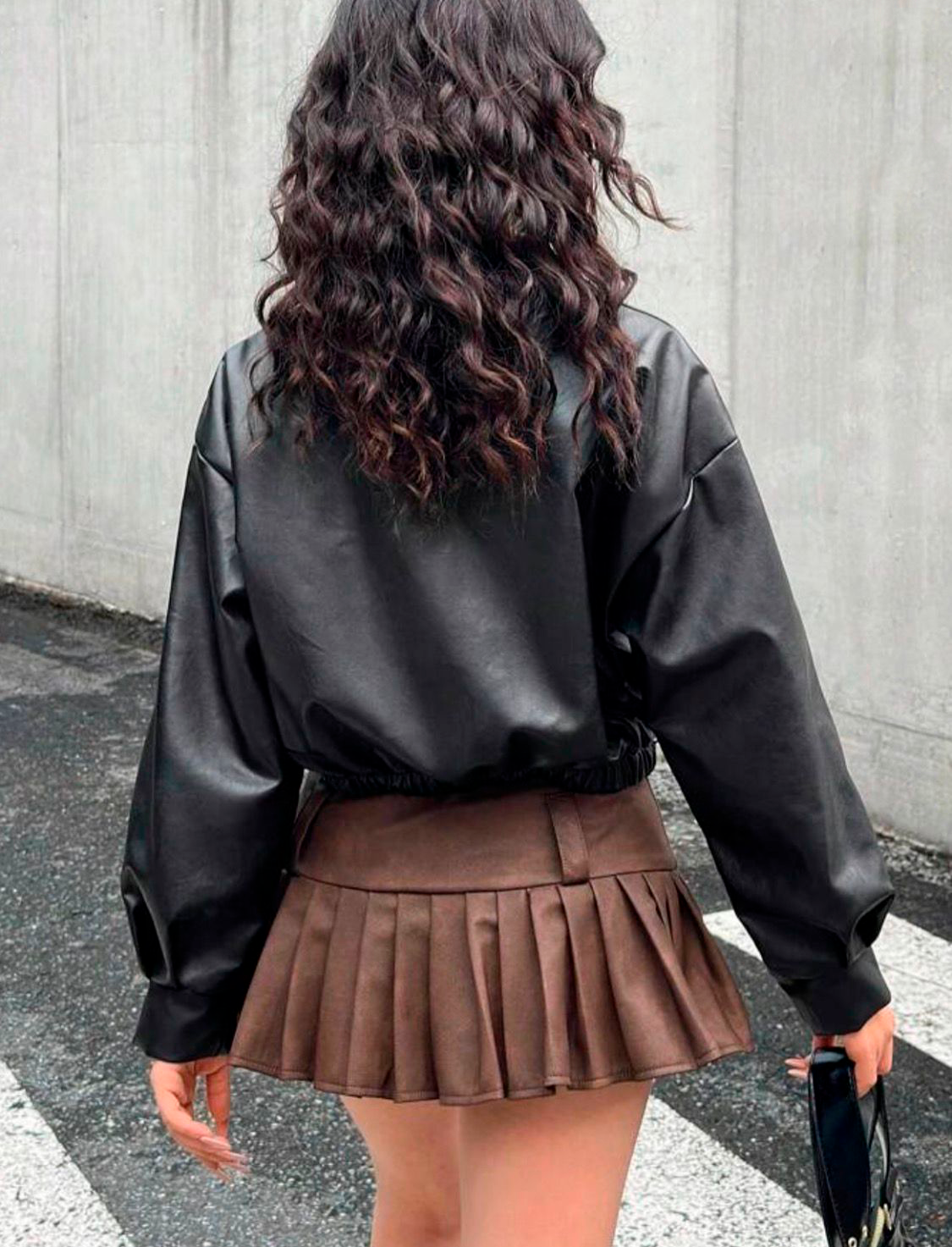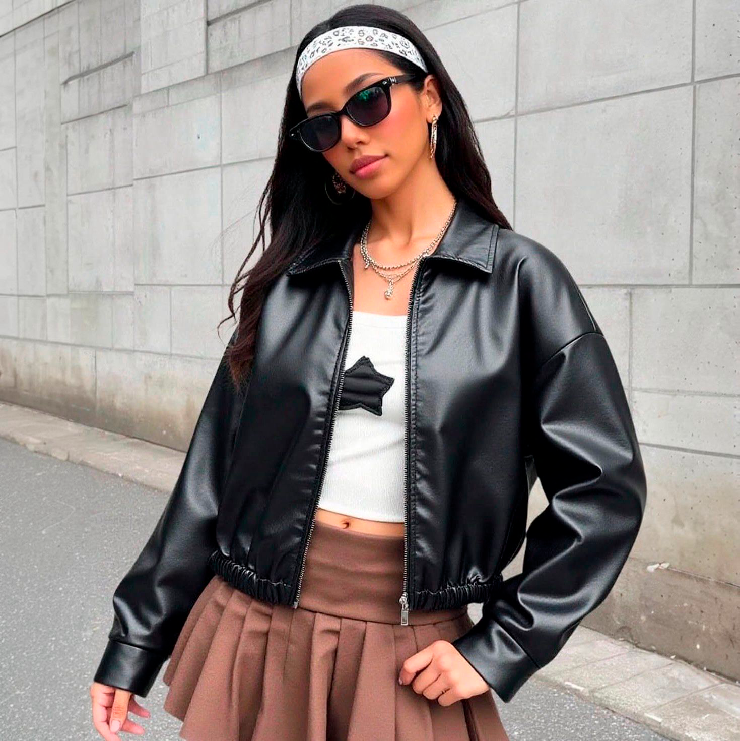 Chaqueta en cuerina para mujer de diseño cómodo casual y moderno con corte ligeramente ancho mangas largas cuello y cierre delantero estilo limpio y versátil ideal para outfits casual chic y looks en tendencia fácil de combinar y perfecta para un estilo femenino actual