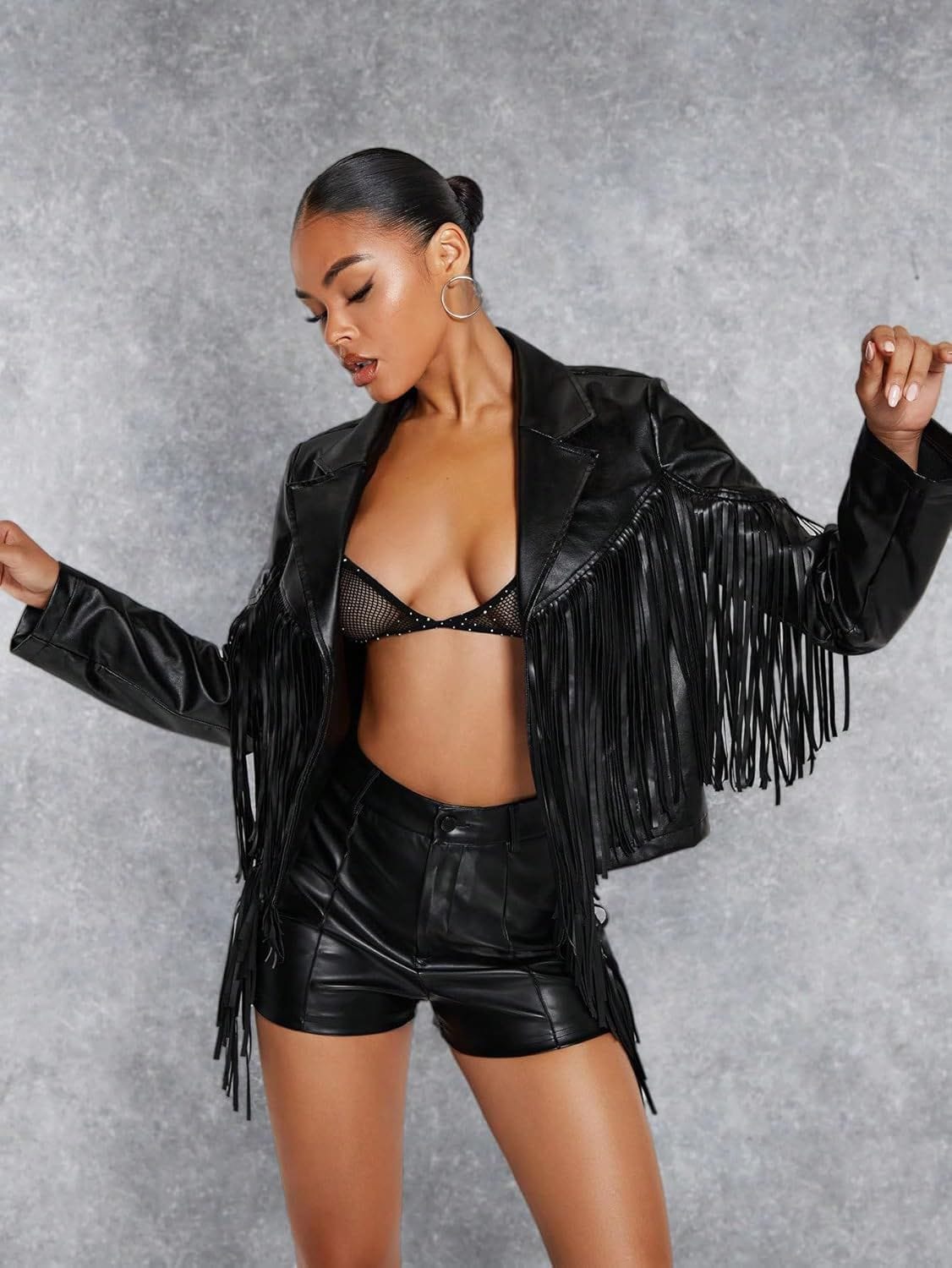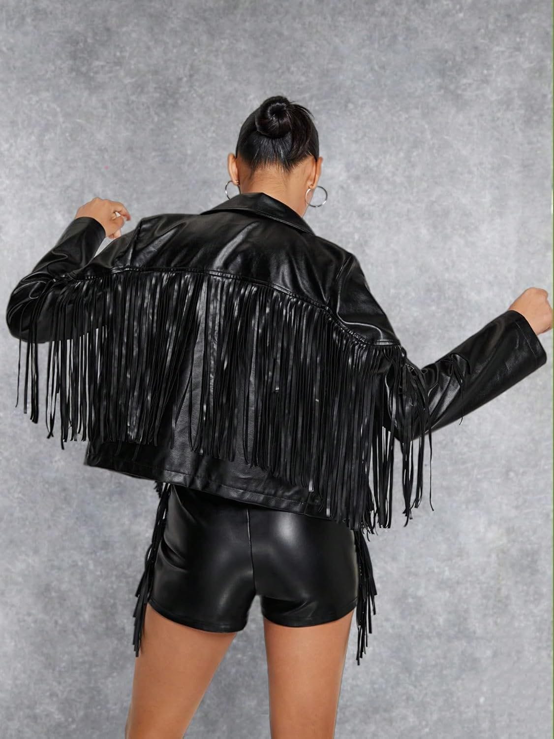 El diseño presenta un cuello ancho y mangas largas que aportan una silueta refinada y estilizada. Los detalles de flecos, meticulosamente colocados alrededor del contorno de la chaqueta, no solo añaden un toque llamativo, sino que también proporcionan un efecto de movimiento y dinamismo, convirtiendo esta prenda en un verdadero statement de moda. Los flecos se mueven con tu cuerpo, creando un impacto visual que hará que te destaques en cualquier ocasión.