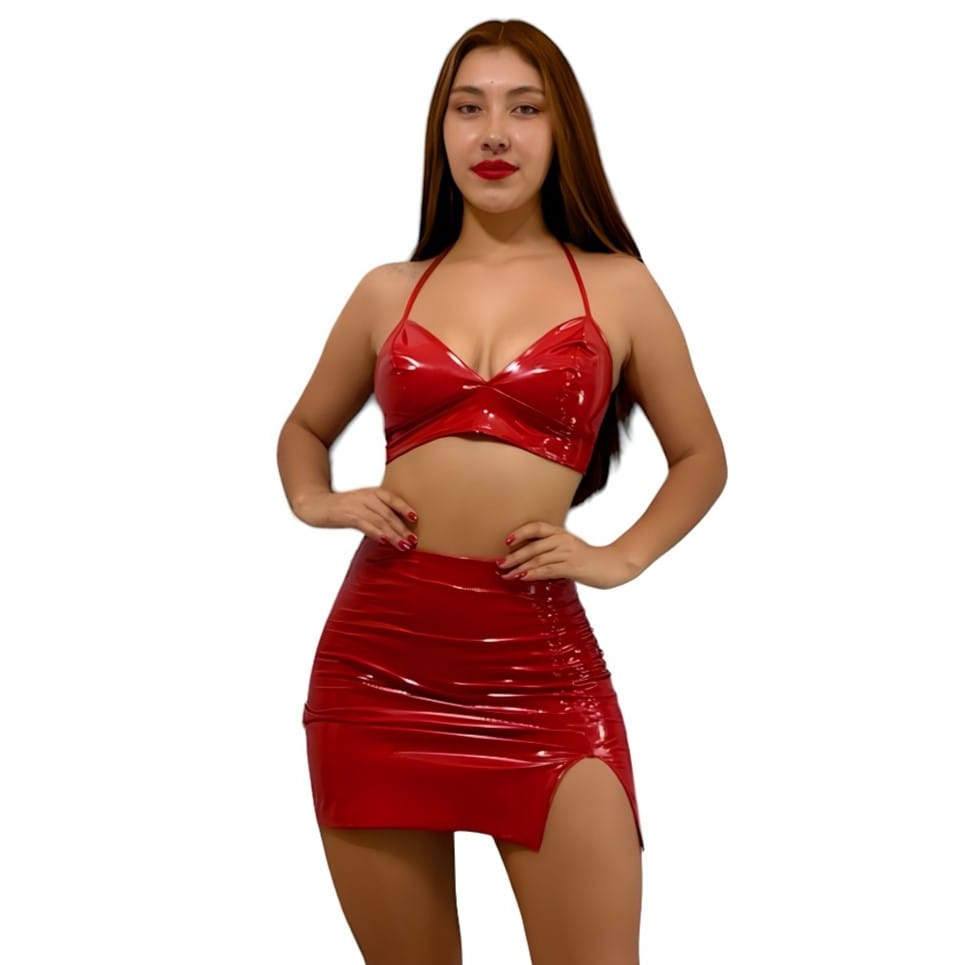 Este conjunto en charol está diseñado para destacar tu lado más sexy y atrevido. El crop top ajustado se asegura con tiras que se atan al cuello, brindando un soporte perfecto, mientras que la parte trasera presenta un diseño entrecruzado único, donde un cordón pasa por ojaletes plateados, creando un efecto visual seductor y ajustable. La falda corta en charol complementa el look con un estilo ajustado que resalta tus curvas y añade un toque provocativo a la prenda. Ideal para una noche especial o una salida con amigas, este conjunto es la opción perfecta para quienes buscan un look llamativo y chic.