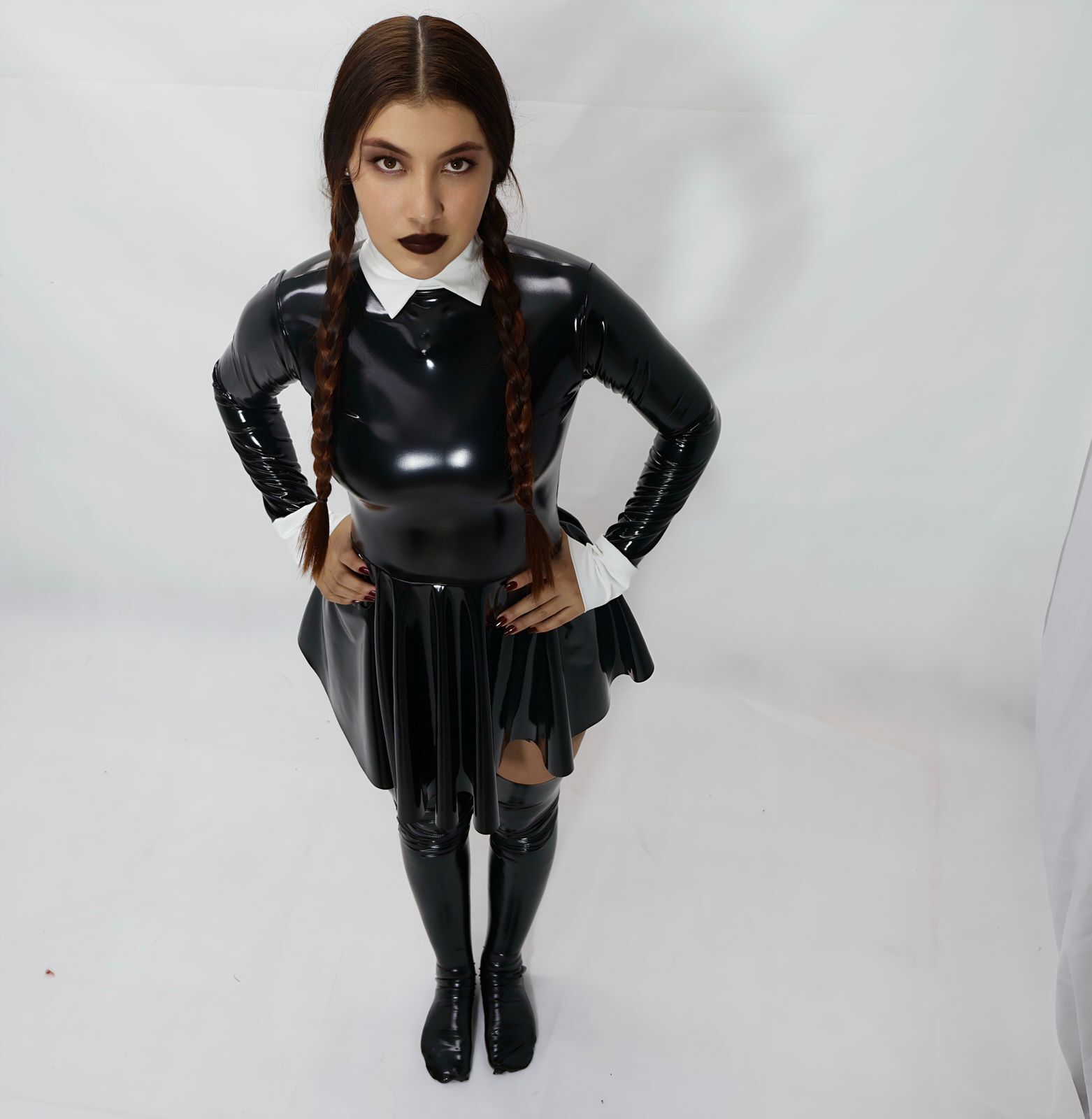 Atrévete a resaltar tu lado oscuro con nuestro conjunto disfraz de Merlina en charol, una prenda única que combina elegancia, sensualidad y un estilo gótico irresistible. Este diseño incluye un vestido corto acampanado con cuello blanco y mangas blancas, un short ajustado y unas medias largas en charol que realzan la figura y añaden un toque brillante y provocador. Inspirado en el encanto misterioso de Merlina Addams, este conjunto es perfecto para fiestas, eventos o sesiones de fotos donde quieras destacar con un look coqueto, oscuro y lleno de personalidad. Su acabado en charol brillante ofrece una presencia impactante y sofisticada, ideal para mujeres seguras de sí mismas que aman el estilo gótico moderno con un toque sexy.