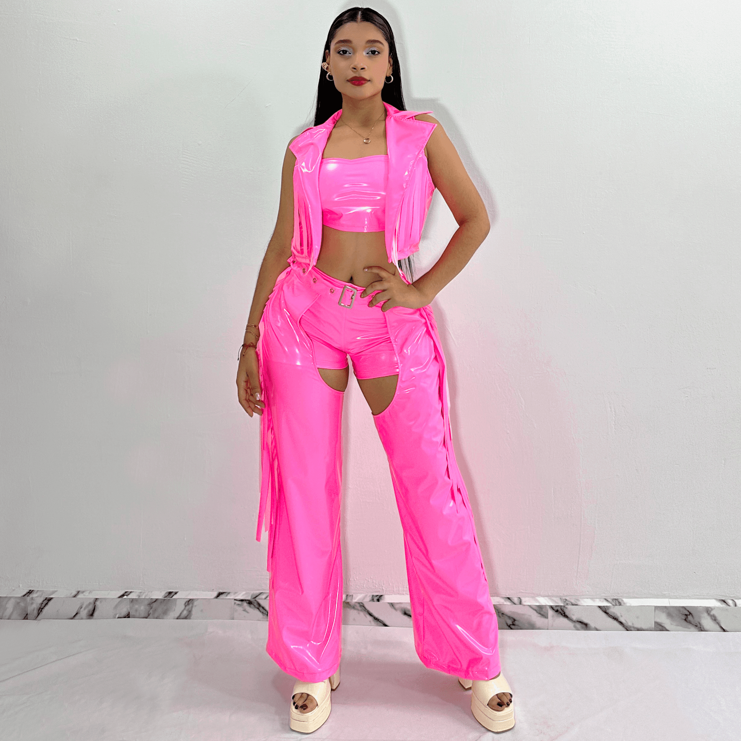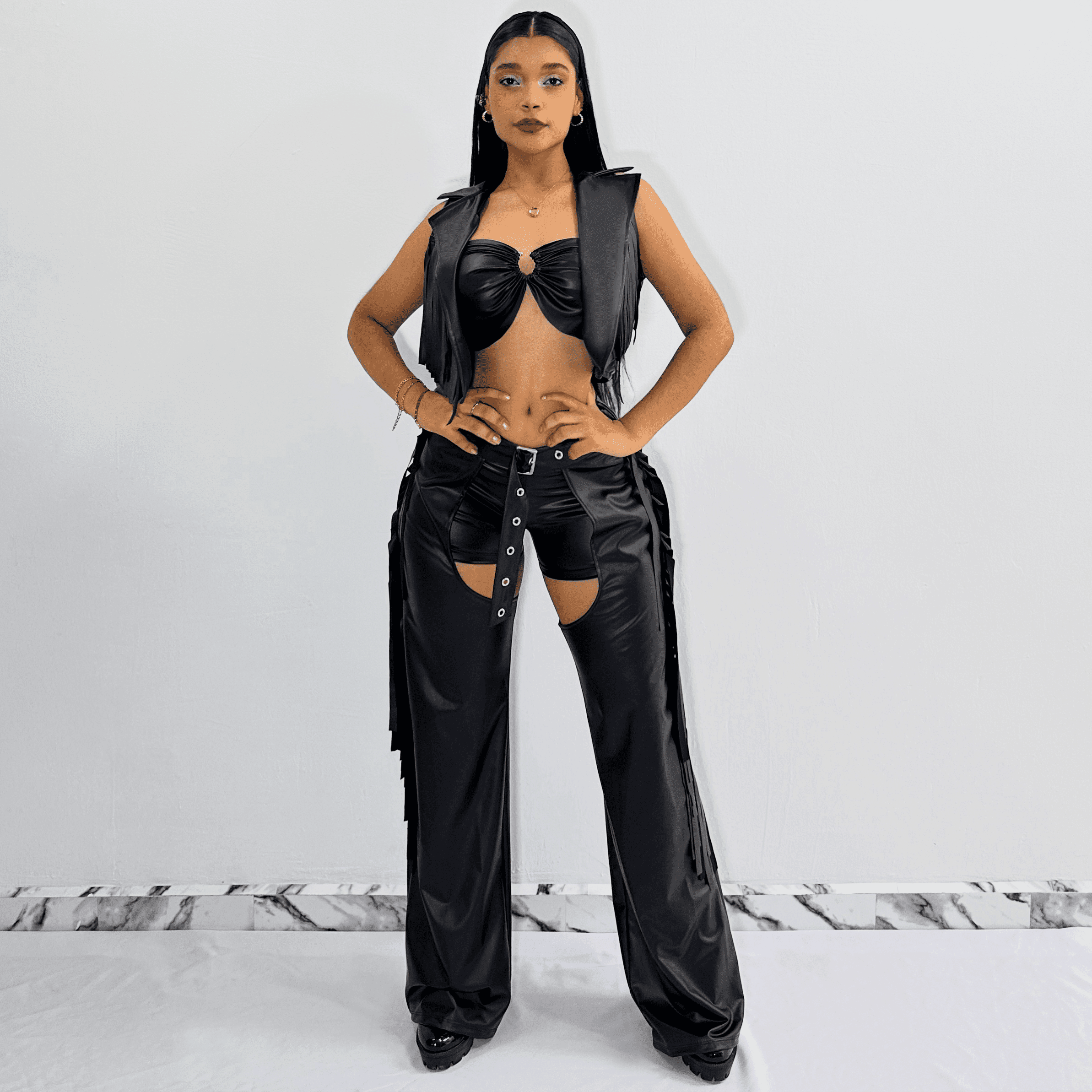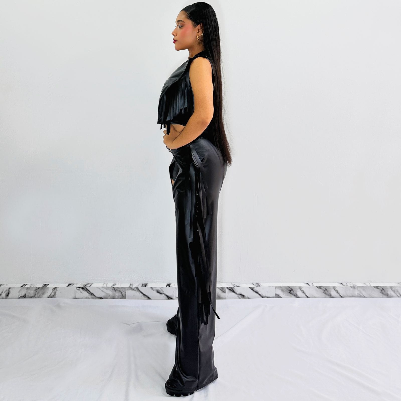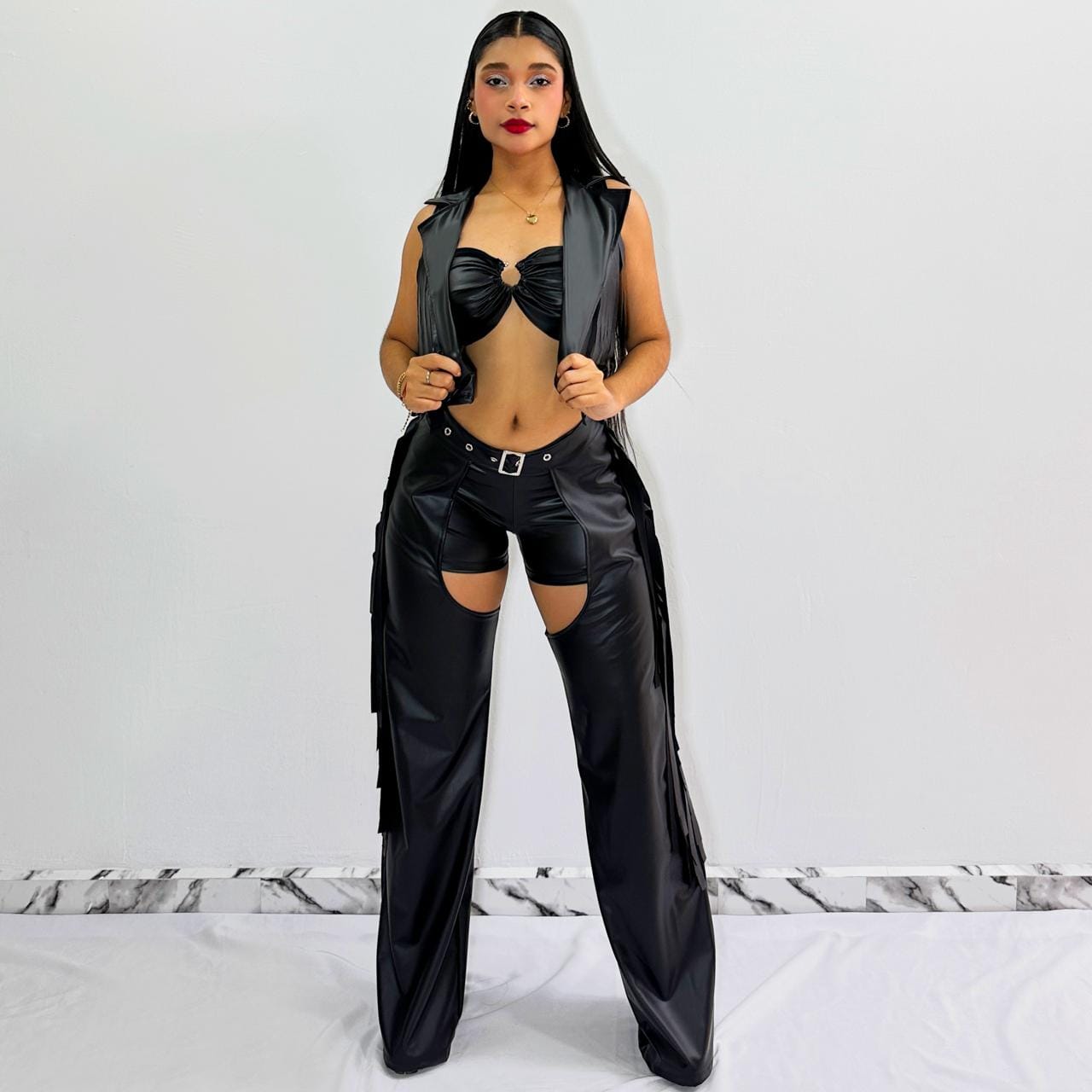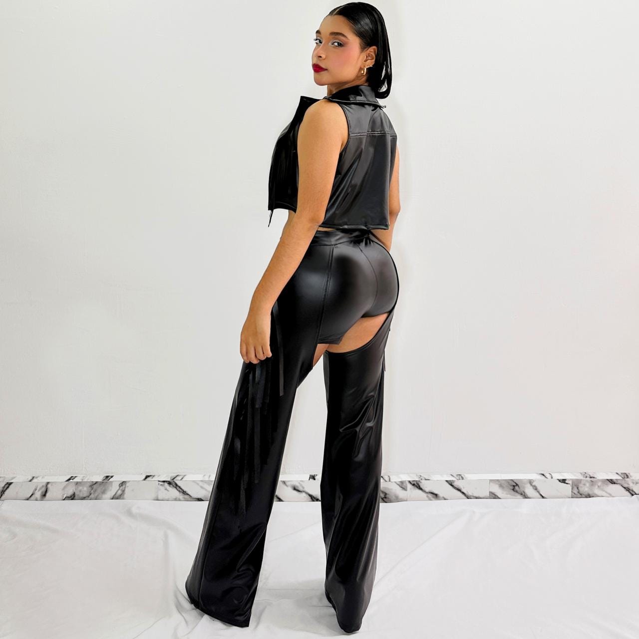 Destaca en tu próximo evento con este conjunto de cuerina estilo Vaquero, diseñado para atraer todas las miradas. Compuesto por un top pequeño que se amarra a la espalda, un short corto, y un pantalón con flecos en los laterales, junto con un chaleco sin mangas con flecos, este conjunto combina un look audaz y elegante. Ideal para quienes buscan un estilo único y llamativo, este conjunto es perfecto para fiestas y eventos especiales donde quieres resaltar con un toque de sofisticación y actitud. ¡Atrévete a destacar con este diseño impactante y exclusivo