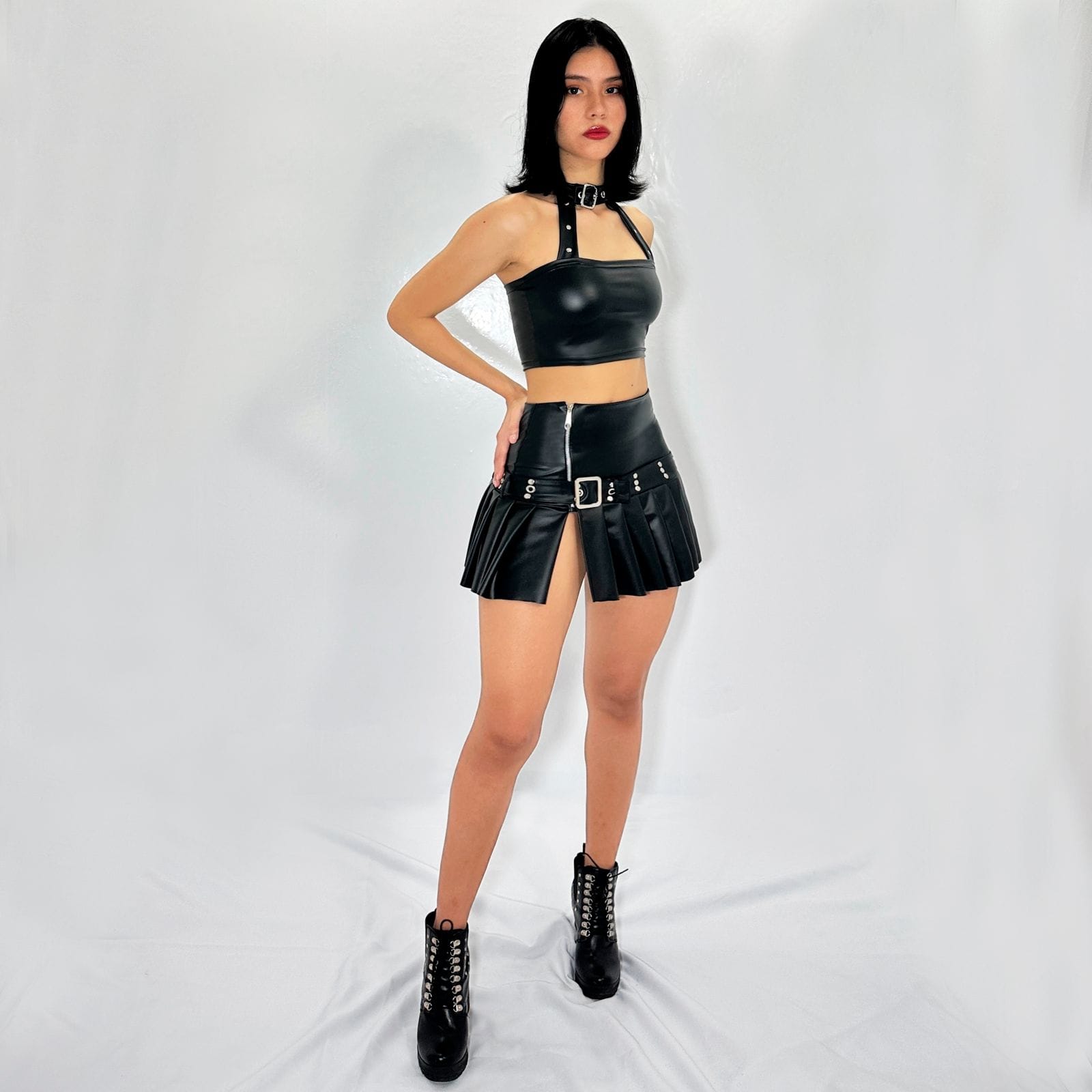 Descubre la sofisticación con nuestro conjunto en cuerina, que incluye una blusa corta y una falda elegante. La blusa destaca por sus dos tiras anchas que sostienen el busto, adornadas con decoración plateada y un cuello unido a las tiras, con ojaletes y una hebilla para un ajuste perfecto. La falda corta presenta un diseño con preses en todo su contorno, un cierre plateado en el lateral y una abertura coqueta debajo del cierre. La parte superior de la falda está rematada con pasadores y un cinturón decorado, ofreciendo un ajuste personalizado y un toque extra de glamour. Ideal para ocasiones especiales, este conjunto combina estilo y elegancia en una prenda única. ¡Añádelo a tu colección y destaca con un look inigualable!