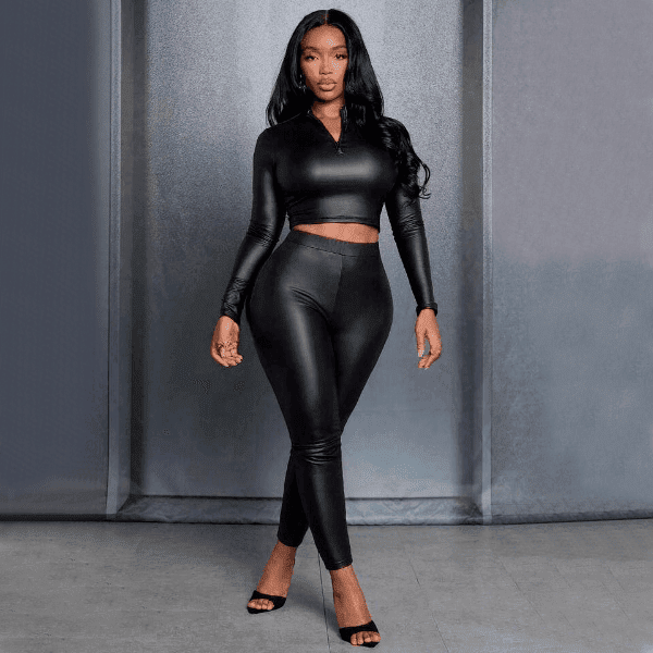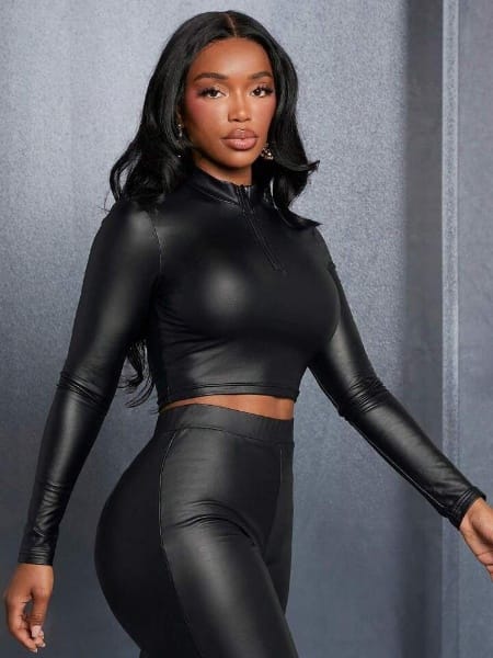 Conjunto en Cuerina: Blusa de Manga Larga con Cuello Alto y Leggings Ajustados