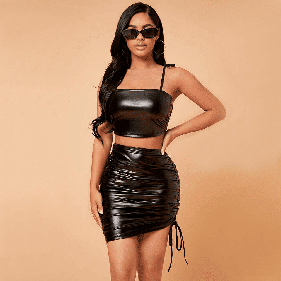 conjunto en cuerina, crop top ajustado, falda surcida, diseño entrecruzado, ropa sexy, estilo elegante, moda de noche.