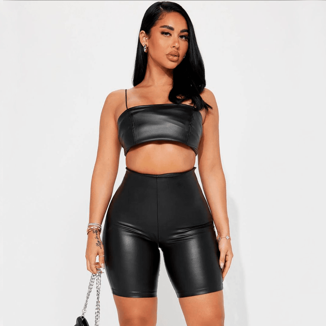 Conjunto Clásico en Cuerina: Crop Top Corto y Short Biker