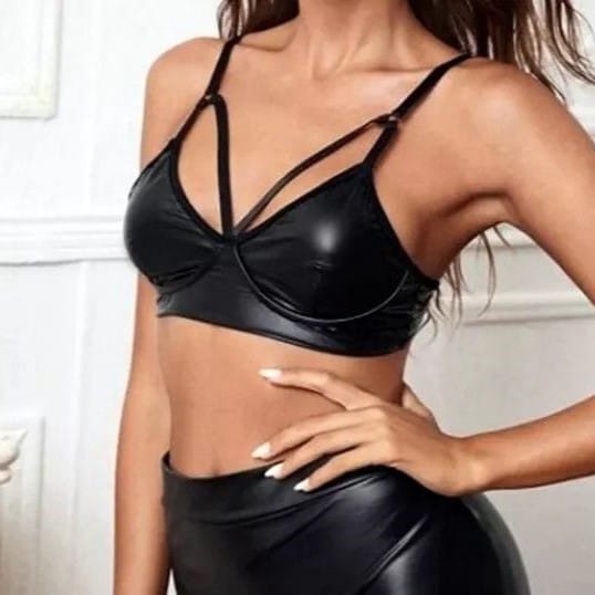 Crop Top de Cuerina Ajustado y Sexy con Tiras Decorativas – Estilo Audaz y Elegante