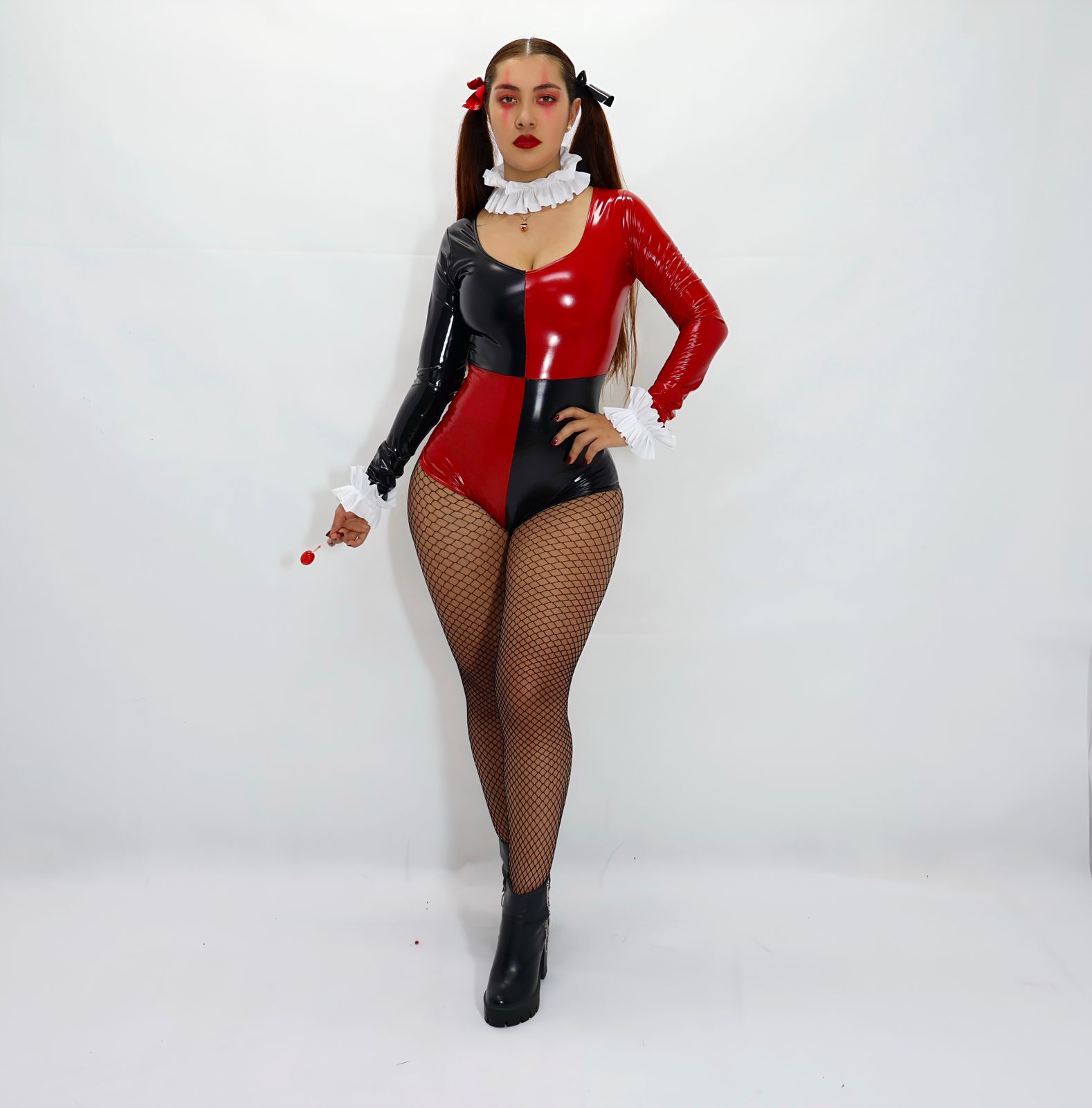 disfraz de Harley Quinn sexy para mujer, un body ajustado con medias de malla que deja ver la piel y detalles blancos en el cuello y muñecas.