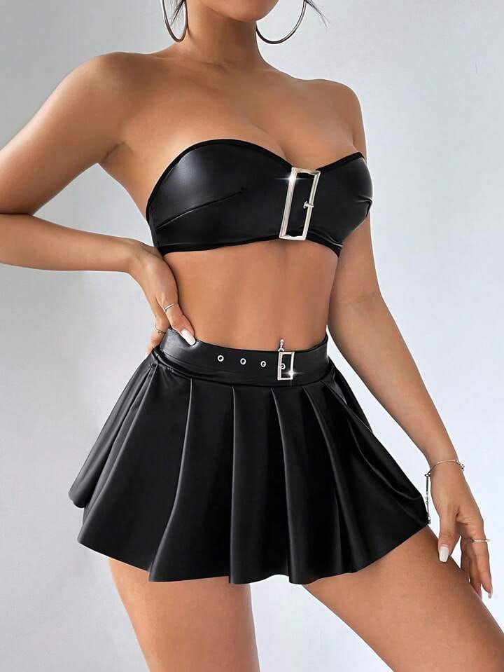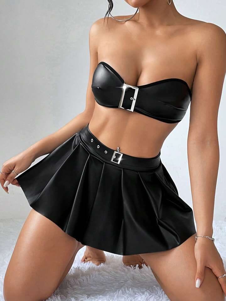 Conjunto de Lencería de Cuerina con Falda con Pliegues y Top Ajustado