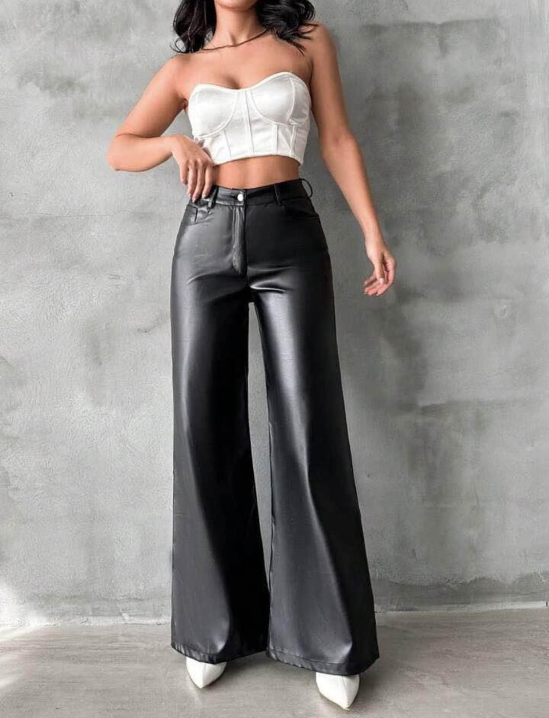 Este pantalón ancho en cuerina es la combinación perfecta de elegancia y comodidad. Diseñado con un corte acampanado que estiliza la silueta y aporta un look sofisticado, cuenta con una pretina delgada con pasadores que permite un ajuste preciso y cómodo. En la parte frontal, destaca un botón plateado y un cierre delantero que realzan su diseño moderno y funcional. Los bolsillos traseros añaden un toque práctico, mientras que los falsos bolsillos delanteros complementan su estilo minimalista y refinado. Fabricado en cuerina de alta calidad, este pantalón es ideal para cualquier ocasión, desde un look casual con zapatillas hasta un outfit elegante con tacones. Su caída fluida y su diseño estructurado hacen de esta prenda una opción imprescindible en el guardarropa de cualquier mujer que busque sofisticación y versatilidad