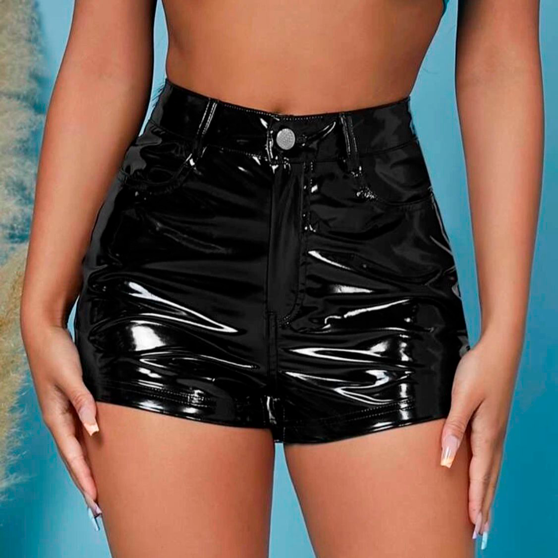 Short corto en charol para mujer con diseño elegante y moderno con cierre delantero botón plateado pasadores en la pretina bolsillos traseros y falsos bolsillos delanteros que crean una silueta limpia y estilizada ideal para outfits casual chic nocturnos eventos especiales combinable con blusas tops y chaquetas