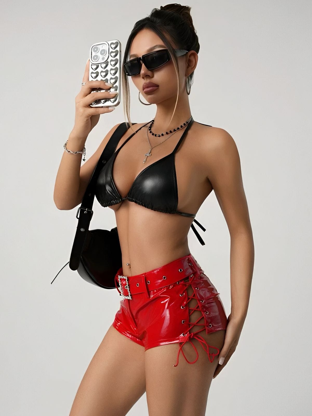 Este short corto sexy en charol es la prenda ideal para resaltar tu estilo audaz y sensual. Con un diseño sin bolsillos, cuenta con un cierre delantero y un botón plateado, que añaden un toque elegante. La pretina delgada con pasadores ajustables ofrece un ajuste perfecto, mientras que el cinturón ajustable permite personalizar la prenda a tu gusto. Lo que realmente destaca de este short son sus laterales, con un diseño entrecruzado y cordones que pasan por ojaletes, creando una silueta sexy y dejando entrever la piel de manera sugerente. Este short es perfecto para quienes buscan un look atrevido y sofisticado, ideal para salidas nocturnas, fiestas o cualquier ocasión en la que quieras causar sensación.