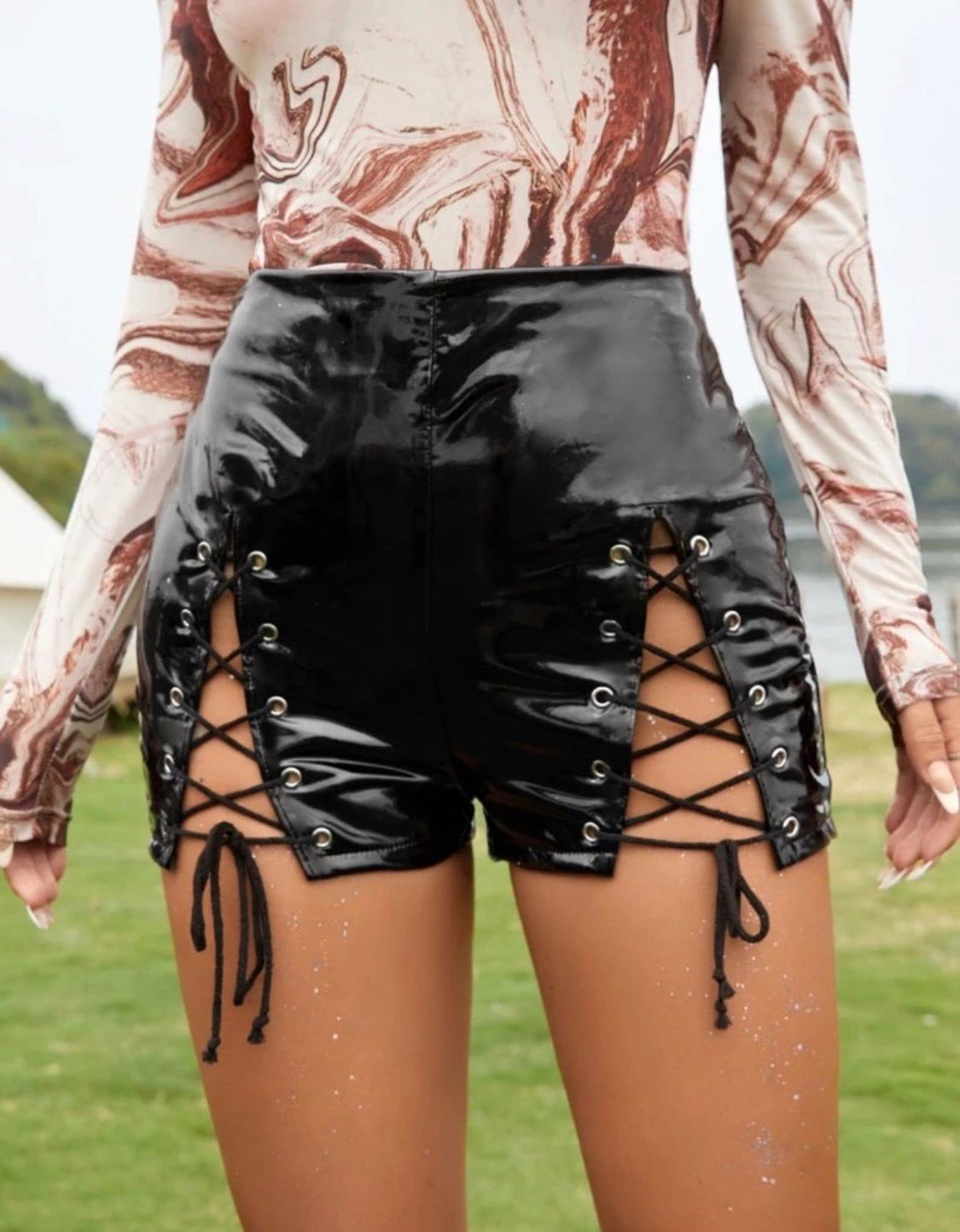 Descubre el short en charol tiro alto ajustado perfecto para resaltar tu figura con un diseño moderno, sensual y elegante. Este short de charol para mujer cuenta con pinzas moldeadoras en la cintura que estilizan y definen la silueta, brindando un ajuste favorecedor que realza tus curvas. Su detalle más llamativo son las aberturas delanteras en cada pierna con cordón entrelazado y ojaletes metálicos, creando un efecto atrevido, sexy y sofisticado que roba miradas. Ideal para outfits de noche, fiestas, discotecas o looks urbanos con estilo, este short ajustado de vinilo combina perfectamente con tops, corsets o blusas modernas. Su acabado brillante tipo látex aporta un toque glam, convirtiéndolo en una prenda imprescindible para quienes buscan un short sexy de moda, ropa en charol femenina, short con aberturas y cordones, y piezas únicas que destaquen en cualquier ocasión.