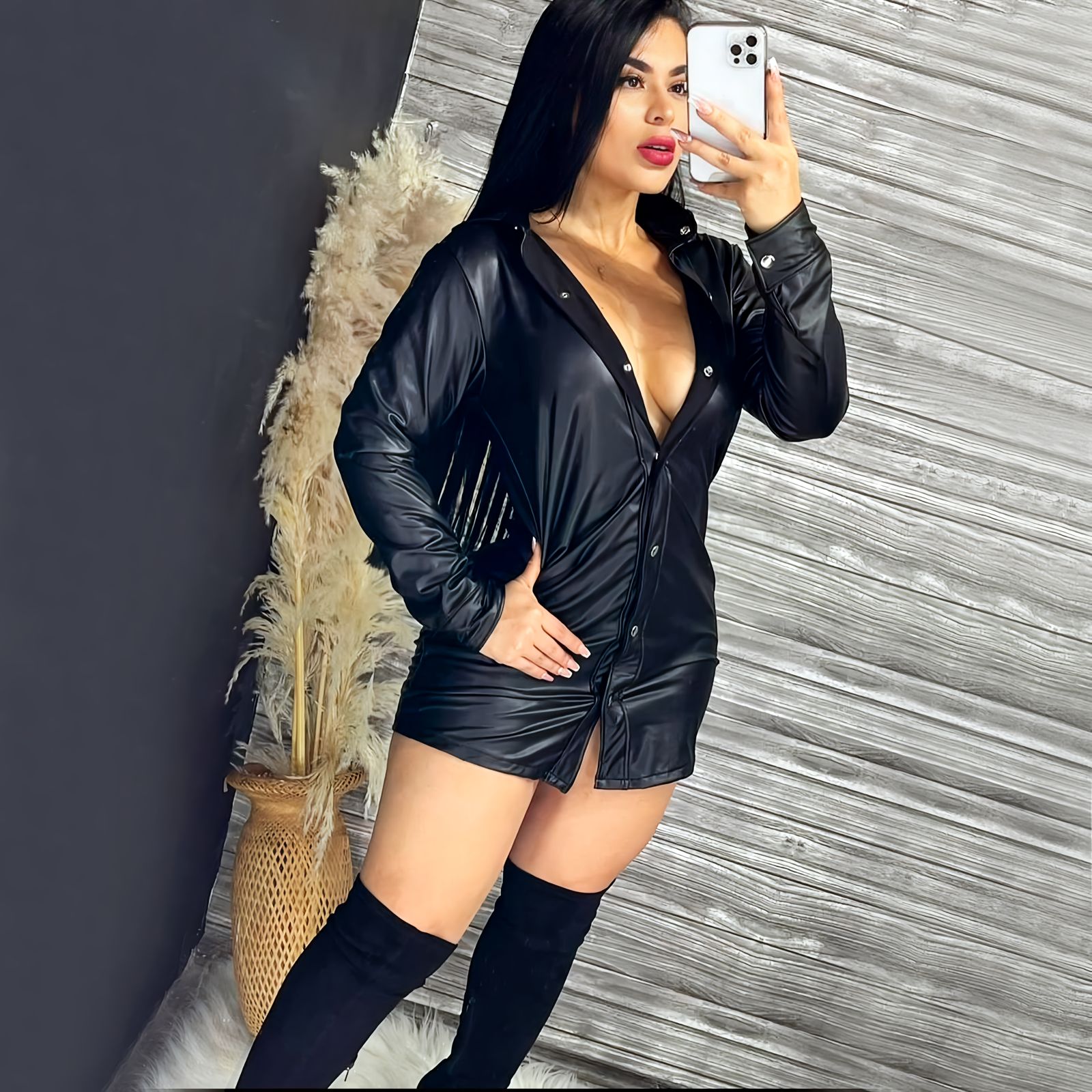 Este vestido camisero en cuerina elegante y sexy es la prenda ideal para mujeres que buscan destacar con un estilo sofisticado y poderoso. Su diseño de manga larga, cuello estructurado y botones plateados delanteros crean un look moderno y llamativo que estiliza la figura y realza la silueta. Confeccionado en cuerina premium, este vestido en cuerina tipo camisero combina comodidad y elegancia, perfecto para salidas nocturnas, eventos especiales o outfits urbanos de lujo. Su acabado brillante y su diseño ajustado lo convierten en un vestido sexy de moda femenina, ideal para quienes aman la ropa en cuerina, los vestidos elegantes, y las prendas sofisticadas con carácter.