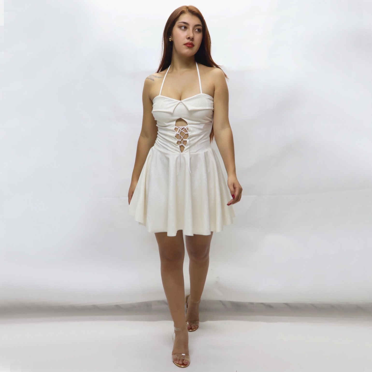 Atrévete a brillar con este vestido corto en cuerina, diseñado para resaltar tu figura con un toque sexy y elegante. Su falda acampanada aporta movimiento y frescura, mientras que el escote entrecruzado con cordones deja ver sutilmente la piel del pecho, creando un diseño provocador y sofisticado. Las tiras delgadas sobre los hombros realzan la feminidad y brindan un ajuste delicado que complementa su estilo moderno. Este vestido en cuerina para mujer es perfecto para noches especiales, eventos o salidas donde quieras destacar con un look atrevido y lleno de confianza. Una prenda que combina moda, sensualidad y elegancia en una sola pieza.